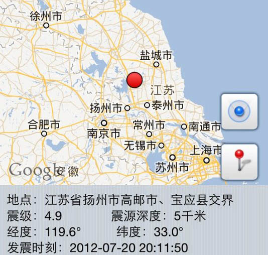 據(jù)揚(yáng)州市地震臺網(wǎng)中心測定,2012年7月20日20時11分在揚(yáng)州高郵、寶應(yīng)交界(北緯33.0度,東經(jīng)119.6度)發(fā)生4.9級地震。