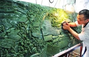 去年,揚州著名漆器點螺大師楊定國曾創(chuàng)作完成了首幅點螺漆畫《清明上河圖》。今年,繼剪紙長卷《清明上河圖》在中國剪紙博物館正式面世之后,揚州玉雕又給世人亮出了最震撼的一筆——碧玉《清明上河圖》插排。