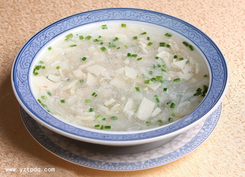 “雪花豆腐”菜名即珠湖雪浪。古代發(fā)明豆腐的是淮南王劉安,關(guān)于淮南王做豆腐的傳說很多:一說劉安在安徽淮南八公山上用大豆煉丹,偶然發(fā)現(xiàn)豆?jié){的凝固現(xiàn)象,逐漸試做出豆腐,在禪內(nèi)秘食,淮南王善于游禪交僧,一日嘗到了和尚們做的豆腐頓覺品味素新,便將豆腐的做法推廣到民間,相傳到各地;還有一說:淮南王劉安非常孝順父母,其母喜吃黃豆,漢高祖十一年時,淮南王的母親生了病,劉安主人把她平時愛吃的黃豆磨成粉,用水沖著喝,并為了調(diào)味放入了一些鹽,結(jié)果就是出現(xiàn)了蛋白質(zhì)凝集的現(xiàn)象,劉安的母親吃了很高興,病也是很快好了,于是鹽鹵點豆腐的技術(shù)便流傳下來。而首創(chuàng)“雪花豆腐”的是揚州高郵人,所以高郵的“雪花豆腐”風味獨特。加工切成的豆腐塊細如飛雪,如珠湖之浪花,它鮮美、香甜、細嫩、光滑、舒適、暖胃,食后回味留連,越吃越想吃。藝術(shù)大師劉海粟曾為其題詞:“其味無窮”。