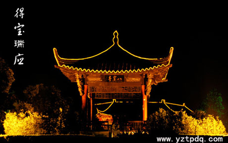 如今,在城中心的縱棹園里。進(jìn)了素磚、高瓦的園門,走過(guò)垂柳依依的石路,踏上溪流涓涓的小橋,那飛檐翹角、凌然欲飛的八寶亭就躍人了你的眼簾。遠(yuǎn)遠(yuǎn)地,趙樸初先生書寫的餾金大字“八寶亭”赫然醒目,映射出寶應(yīng)唐代繁華歷史。