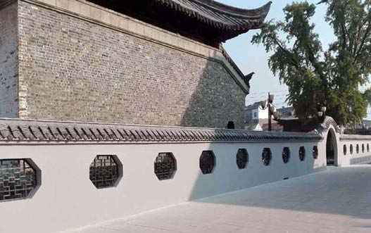 二期工程主要包括學宮圍墻的建立。因?qū)殤?yīng)學宮在寶應(yīng)城中小學內(nèi),為保證學生的人身安全,同時也出于保護古建筑的目的,寶應(yīng)學宮在大成殿和明倫堂的外圍建立了仿古圍墻。整個圍墻仿明清時代建筑風格,建造的扇形拱門鑲上了花邊屋檐,引人入勝,更仿造古典園林造園藝術(shù),在圍墻上裝上了花格窗,以達到“移步換景”的目的。透過花格窗向里看寶應(yīng)學宮,更別有一番風味。
