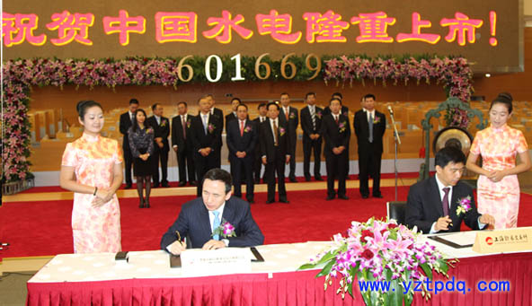 中國水電(股票代碼601669)首次公開發(fā)行A股上市儀式10月18日上午在上海證券交易所舉行。中國電力建設集團公司董事長、中國水利水電建設股份有限公司董事長范集湘,中信建投證券股份有限公司董事長兼總裁王常青,中銀國際證券有限責任公司副執(zhí)行總裁任勁,國務院國資委副秘書長閆曉峰先后致辭;范集湘董事長與上海證券交易所副總經(jīng)理徐明簽訂上市協(xié)議書;國務院國有企業(yè)監(jiān)事會主席李志群和中國電力建設集團公司董事長、黨委副書記、中國水利水電建設股份有限公司董事長范集湘共同為中國水電上市鳴鑼。