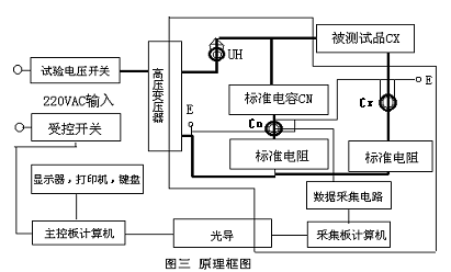 TPJSC系列智能化抗干擾介質(zhì)損耗測試儀測量線路包括一路標(biāo)準(zhǔn)回路和一路測試回路,如圖三所示。標(biāo)準(zhǔn)回路由內(nèi)置高壓穩(wěn)定度標(biāo)準(zhǔn)電容器與標(biāo)準(zhǔn)電阻網(wǎng)絡(luò)組成,由計算機(jī)實時采集標(biāo)準(zhǔn)回路電流與測試回路的電流幅值及其相位差,并算出被測試品電容容值(CX)和介質(zhì)損耗(tgδ)。