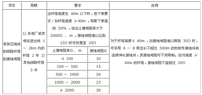 表1 桿塔的工頻接地電阻測量周期及要求