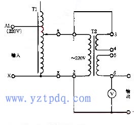 若按本圖所示,用一臺(tái)交流接觸式調(diào)壓器T1和一只初級(jí)220V,次級(jí)為雙30V的電源變壓器T2(要求T2功率大于用電器具的功率)串聯(lián)使用,則可實(shí)現(xiàn)輸出電壓比輸入電壓提高90V。