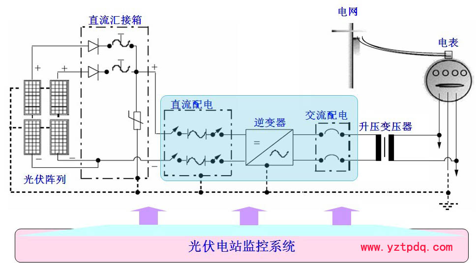 光伏并網(wǎng)發(fā)電系統(tǒng)是由光伏組件(方陣),光伏并網(wǎng)逆變電源,防雷匯流箱,交直流防雷配電柜及光伏電站運行監(jiān)控系統(tǒng)組成。
