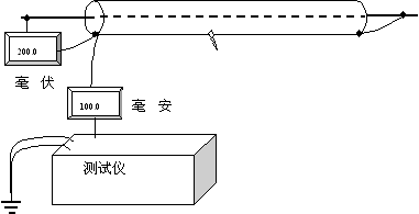 接線圖如下,在測試端的芯線和外護(hù)套上接毫伏表(萬用表毫伏檔),表筆直接與芯線和外護(hù)套接緊,不要接到儀器輸出線的夾子上,避免接觸電阻影響毫伏表的測量結(jié)果;儀器設(shè)置在連續(xù)輸出檔,調(diào)整輸出電壓,使輸出電流達(dá)到A1(整數(shù)如100.0mA),這時讀取毫伏表上的讀數(shù)V,由于電壓表輸入電阻很高,因此,流經(jīng)項(xiàng)線的電流很小,可以認(rèn)為毫伏表的電位測量端到故障點(diǎn)的電位,因此,該讀數(shù)即為測量端到故障點(diǎn)兩點(diǎn)的電位差V1。再將儀器移到電纜的另一側(cè)(末端)進(jìn)行測量,讓輸出電流值與始端測量時的數(shù)值一致,這時毫伏表的讀數(shù)為V2;