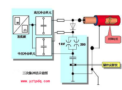 三次脈沖法是二次脈沖法的升級。其方法是首先在不擊穿被測電纜故障點(diǎn)的情況下,測得低壓脈沖的反射波形,緊接著用高壓脈沖擊穿電纜的故障點(diǎn)產(chǎn)生電弧,在電弧電壓降到一定值時觸發(fā)中壓脈沖來穩(wěn)定和延長電弧時間。之后再發(fā)出低壓脈沖,從而得到故障點(diǎn)的反射波形,兩條波形疊加后同樣可以發(fā)現(xiàn)發(fā)散點(diǎn)就是故障點(diǎn)對應(yīng)的位置。由于采用了中壓脈沖來穩(wěn)定和延長電弧時間,它比二次脈沖法更容易得到故障點(diǎn)波形。相對于二次脈沖法由于三次脈沖法不用選擇燃弧的同步時長,操作起來也更加簡便。三次脈沖代表性儀器為:三級多次電纜故障測試儀。