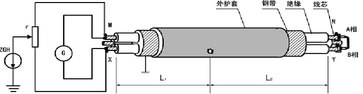 電橋法原理如下:將被測電纜故障相與非故障相短接,電橋兩臂分別接故障相與非故障相,調(diào)節(jié)電橋兩臂上的一個可調(diào)電阻器,使電橋平衡,利用比例關(guān)系和已知的電纜長度就能得出故障距離。