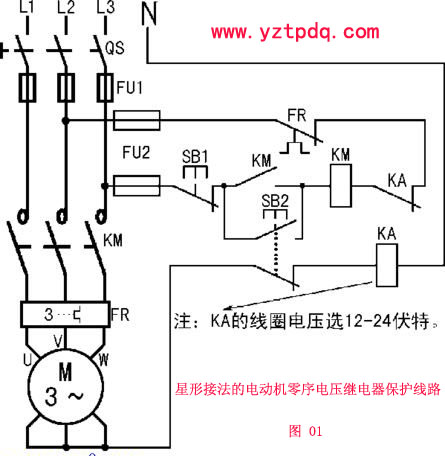 圖01所示為星形接法的電動(dòng)機(jī)之零序電壓繼電器保護(hù)線路。
