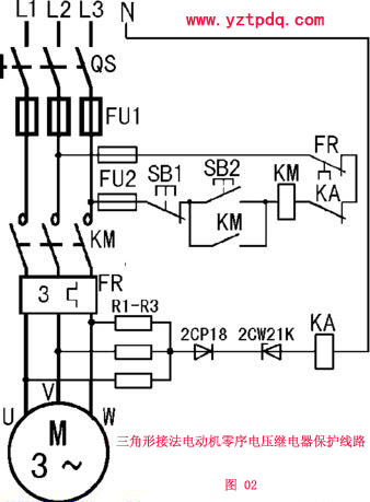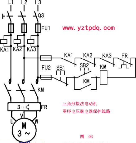 圖02所示為三角形接法電動(dòng)機(jī)零序電壓繼電器保護(hù)線路。