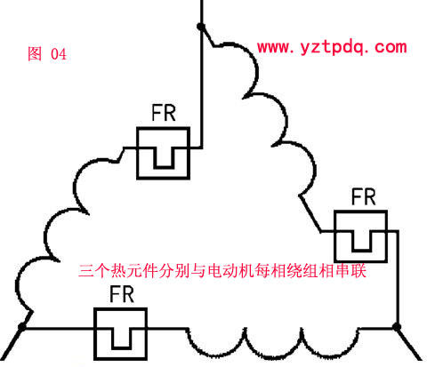 把普通熱繼電器的三個(gè)熱元件分別與電動(dòng)機(jī)每相繞組相串聯(lián),如圖04所示。