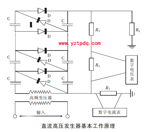 如下圖所示,高頻變壓器的輸入端接受中高頻電壓信號(hào),通過(guò)倍壓整流電路(整流硅堆D以及電容器C),達(dá)到直流高壓的輸出。圖中,R1為電流測(cè)量采樣電阻,流過(guò)R1的電流即流過(guò)負(fù)載RL的電流。R2、R3,為高壓測(cè)量電阻,兩者共同構(gòu)成分壓電路(R3為高壓臂,R2為低壓臂)。直流高壓發(fā)生器裝配結(jié)構(gòu)是:R1,R2置于直流高壓發(fā)生器控制箱,R3與中高頻變壓器、倍壓整流電路等置于倍壓筒??刂葡漭敵龅闹懈哳l電壓信號(hào)通過(guò)專用電纜與倍壓筒相連。