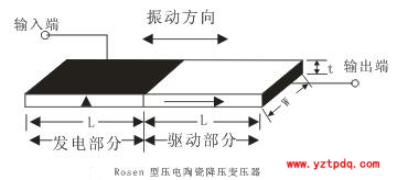 整個壓電變壓器可以分成兩部分:下半部分沿厚度方向極化且沿徑向應變,作為輸入端,稱為驅動部分;上半部分也沿厚度方向極化且沿徑向應變,作為輸出端,稱為感應部分。當正弦交變電壓加到輸入端時,壓電變壓器產(chǎn)生沿徑向振動;而感應部分通過正壓電效應,產(chǎn)生電壓輸出。