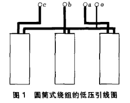 對(duì)于小型配電變壓器,例如500kVA及以下的產(chǎn)品,低壓為圓筒式繞組,y接線在繞組的上部(見圖1)。中性點(diǎn)引線很短,雖然設(shè)計(jì)規(guī)定引線設(shè)計(jì)按25%額定電流設(shè)計(jì),但在實(shí)際制造中,有的與其它引線相同,有的截面略小,因此中性點(diǎn)引線電阻所占比例不大,測(cè)線電阻、相電阻能滿足標(biāo)準(zhǔn)要求。