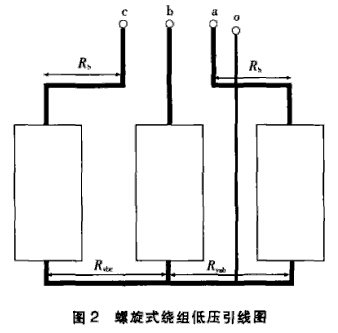 但對(duì)于630kVA及以上的配電變壓器,低壓多為螺旋式繞組,y接線在繞組的下部(如圖2所示)。中性點(diǎn)引線較長(zhǎng),按25%額定電流設(shè)計(jì)。這樣,中性點(diǎn)引線電阻隨著容量的增大,所占的比重越來越大。執(zhí)行JB/T501-1991時(shí),就會(huì)出現(xiàn)Rca>Rab=Rbc,這一規(guī)律完全是產(chǎn)品結(jié)構(gòu)造成的。