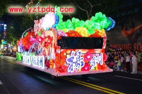 9月15日,上海旅游節(jié)開幕大巡游在上?;春B放e行,共有21輛花車和30支境內(nèi)外表演團隊亮相。其中,揚州選送的“運河名城、精致?lián)P州”大型花車,展示了古城揚州的迷人風采。由揚州市旅游局選送制作的揚州花車首次以揚州城市代表身份參加了2012上海旅游節(jié)花車巡游活動。